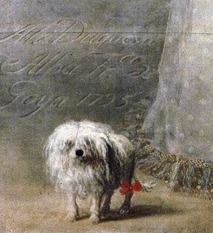Es la misma variación que Goya dibuja, una y otra vez, en el halda o a los pies o apartado. Una especie de cronología de la desgracia, rechazo y abandono. Aquí el falderillo junto a la duquesa De Alba (1795). Fragmento. Francisco De Goya.