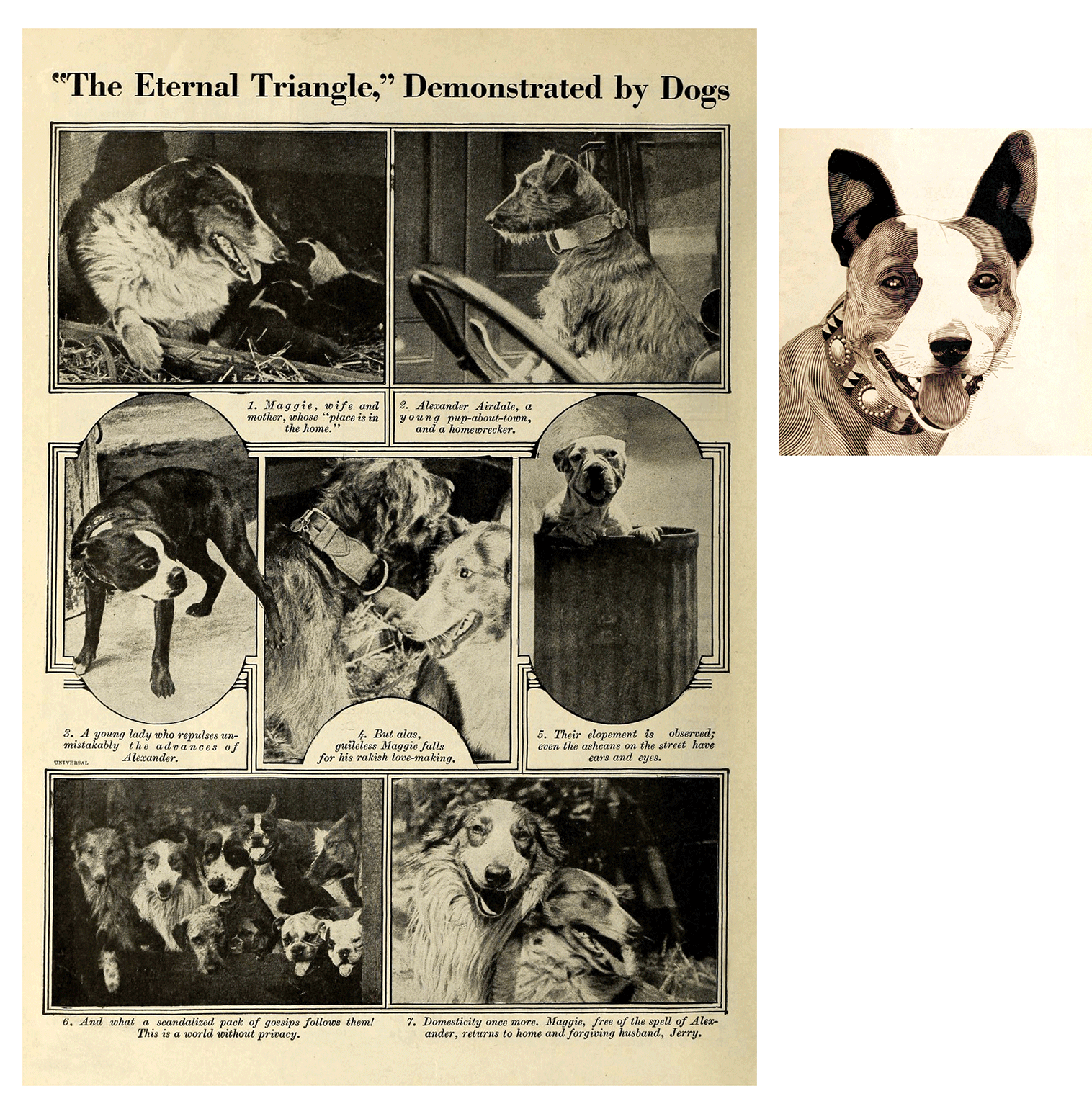 Entre 1919 a 1922, el mesticillo y prodigioso Brownie The Dog actuó en casi sesenta películas, tras ser rescatado de una perrera y luego entrenado por Charles Gee. The eternal triangle narra la historia de un marido infiel, la revancha y la reconciliación, lo que incitó a la Manitoba Board of Moving Picture Censors a pedir la retirada del filme en 1919, sin conseguir opacar al elenco canino que interpretó la historia…, sin humanos en escena. En Live wires se exigió la eliminación de las secuencias en las que Brownie aparecía jugando a los dados y recogiendo el importe de la apuesta. El crítico Karl K. Kitchen lo denominó «La Super Inteligencia».