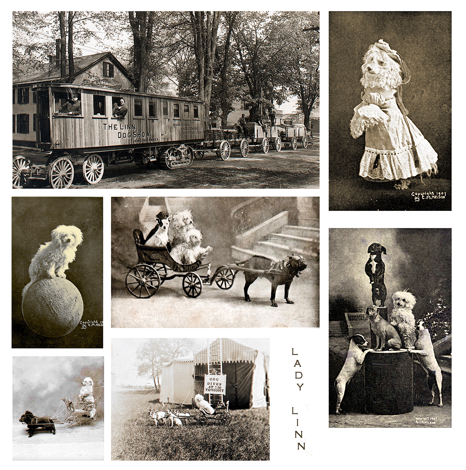 La frágil caniche (toy), del Linn’s Famous Educated Dog, fue la gran atracción de este espectáculo itinerante desde 1903 hasta 1910. Cuando la compañía comenzó a triunfar, el músico Mr. Linn (Holman Harry Flannery Linn) decidió ampliar el número de perrillos, de cómicos y de músicos. Por esta razón ideó un vehículo bien equipado y cómodo (Linn Trailer), una especie de locomotora de carretera que fue mejorando gracias a la ayuda de las empresas Morris y Lombard. Además, el mismo vehículo suministraba energía suficiente para la iluminación del espacio y la proyección de películas. Ahí estuvo Lady Linn, protegida en los largos inviernos, antecesora del tractor, de la barredora de nieve, y de los futuros vehículos que junto a ella se originaron.