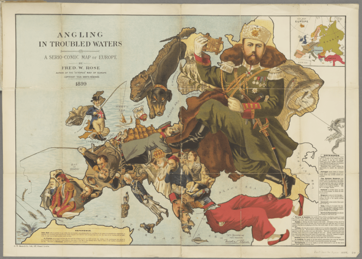 Eran mapas antropomorfizados, donde Suecia y Noruega podían ser un Ortro –perro de dos cabezas–, sujetado por la cola en manos de Rusia, en la ilustración Angling in Troubled Waters, a Serio-Comic Map of Europe, de Fred W. Rose (1899)
