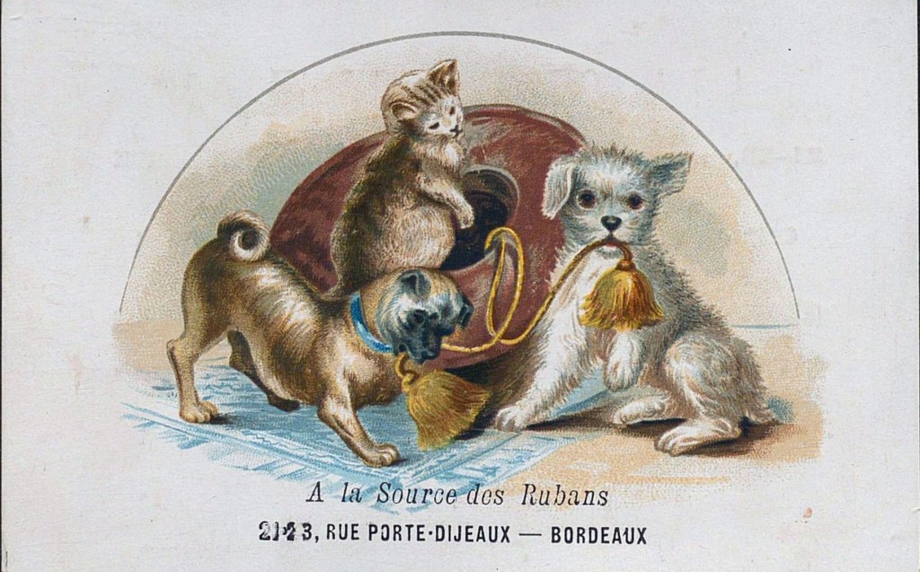 Pertenecían al Grand Circus y realizaban números de equilibrismo, pero no eran sus nombres, y sí sus razas, lo que servía para publicitar la marca Chadwick’s J&C (entre 1870 a 1900), una empresa dedicada a la manufactura de bobinas y carretes de hilo para costura. La marca era el ‘top 1’ de la calidad en Gran Bretaña, el más resistente, el mejor algodón con gran variedad de colores, hebras y diámetros. Acaso la elección de los falderillos muestra esa fragilidad aparente del hilo, que a la vez reúne la fortaleza de cada raza; el Sky (terrier) con su resistencia infatigable, el Pug por su tenacidad robusta, y un Charles (King spaniel) para indicar suavidad, tersura y delicadeza… El equilibrio perfecto.