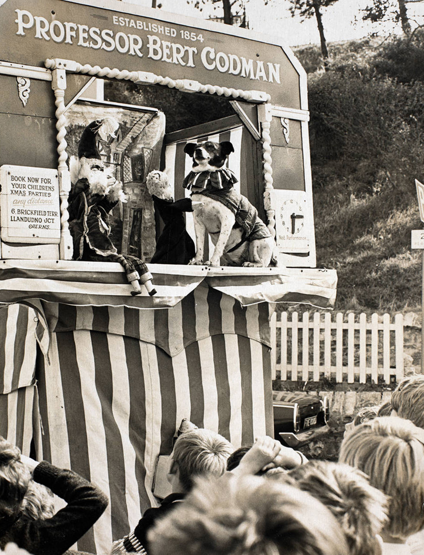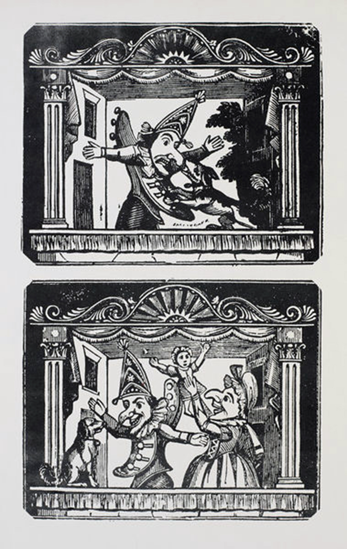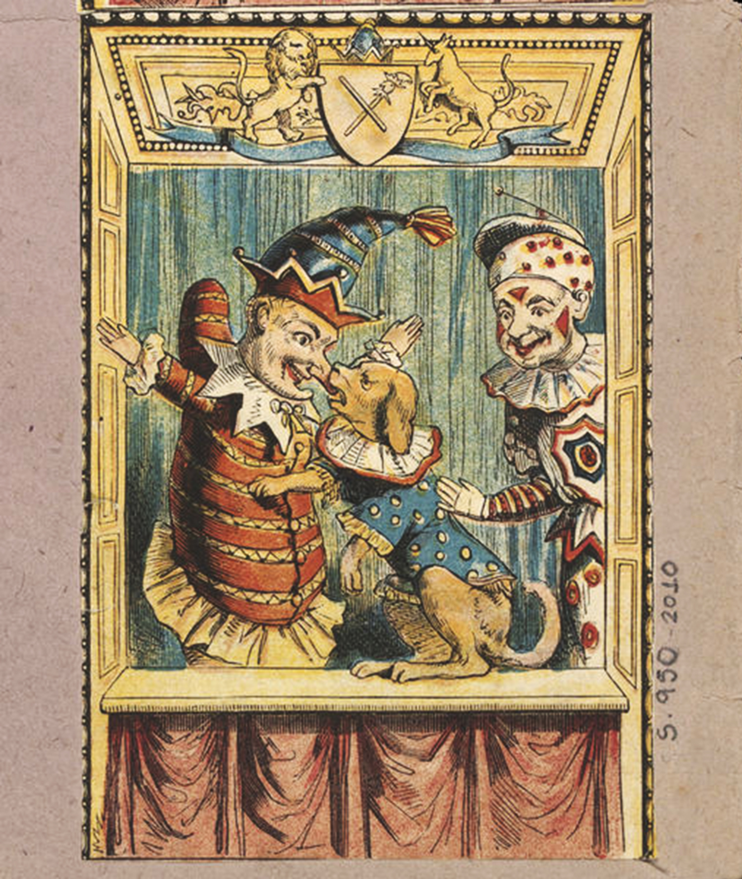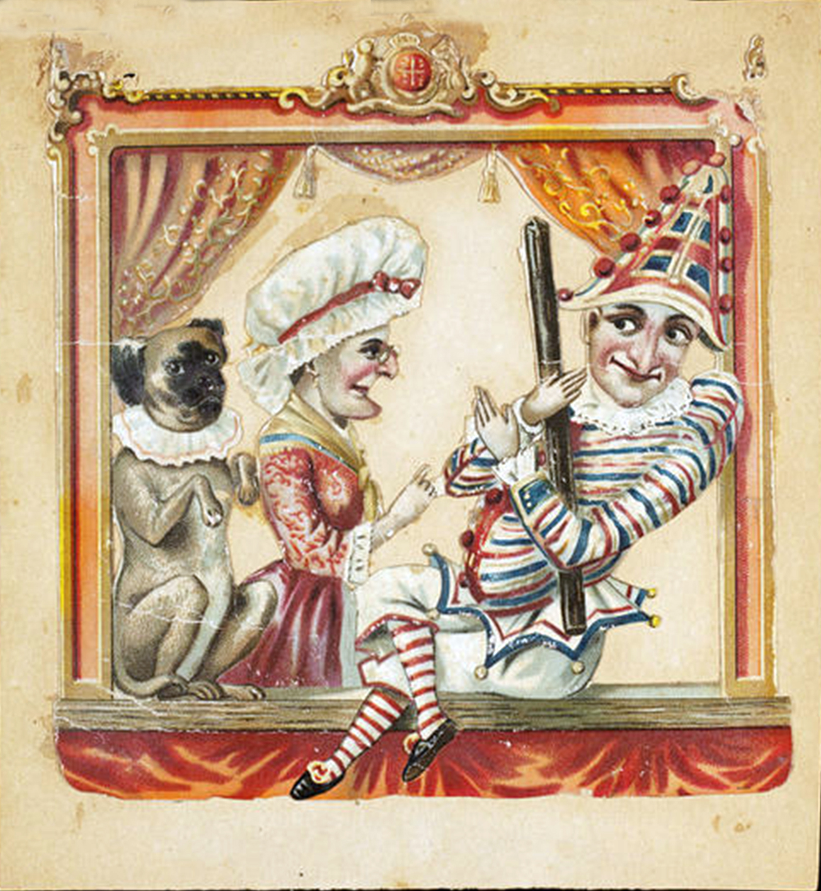 «En principio fue un espectáculo de marionetas, hacia 1662, que llenaba el Covent Garden (Londres), a cargo del italiano Pietro Gimonde de Bolonia, también conocido como Signor Bologna… Punch se convirtió en toda una celebridad durante el siglo XVIII, tanto en teatros como en ferias… El argumento variaba, aunque la constante fue que luchaba contra el Diablo, que a veces ganaba y otras, no. En 1738 la actriz y titiritera Charlotte Charke recibió una licencia para abrir el Punch’s Theatre en James Street (Londres), y de ahí pasó a ser un guiñol, se simplificó o bien resultó ser la forma más práctica para un teatrillo callejero… En 1825 la esposa del bufón Punch se llamó Judy, pero siempre estuvieron acompañados de un perro llamado Toby, que solía ser real…» (Punch & Judy, History) Por lógica, y durante cientos de años, Toby debió de ser necesariamente un perro pequeño para poder interactuar en ese constreñido escenario y poder equipararse al guiñol.