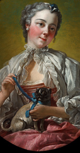 Para algunos es una mujer con un pequeño ‘pom’; para otros es una mujer, más un bello traje de época, más un falderillo que completa el conjunto; algunos ven un voluptuoso mundo imaginado que se plasma en este lienzo (óleo de c.1762); otros han concluido que la modelo pudo ser, casi con seguridad, Marie-Émilie Coignet de Courson (1727–1806). Para quien lo pintó, Jean Honoré Fragonard, estaba cercano a la idea de que no es sólo una bella joven retratada, sino que contiene lo que fue y podrá ser. Fragonard fue olvidado durante casi un siglo, y parte de su supervivencia se debió a Madame du Barry, quien le encargó numerosas pinturas para embellecer su palacio (la serie Los progresos del amor en el corazón de las jóvenes). Ese silencio y desaparición probablemente se debieron a que «La Revolución francesa puso fin a la demanda de obras del género galante, hasta el punto de que los últimos años de la vida del pintor transcurrieron en la miseria.»