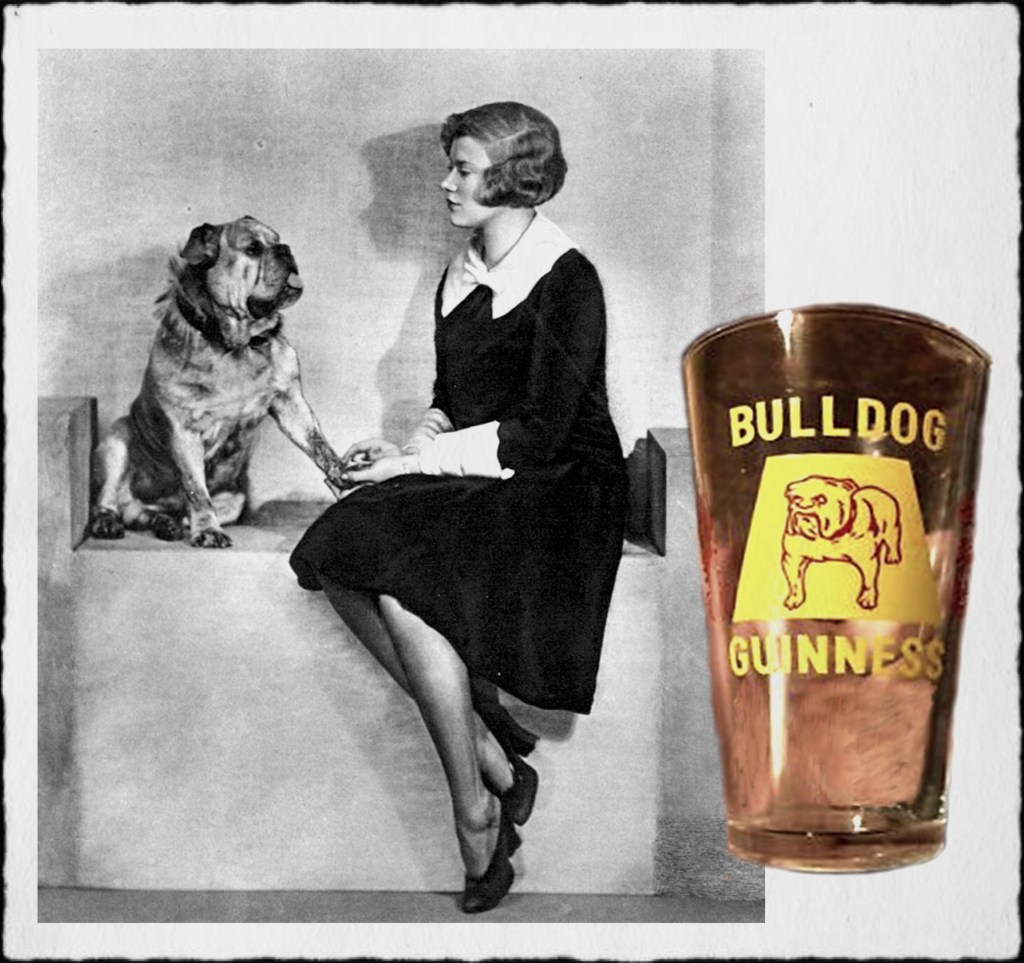 Pareciera como si a Maureen Guinness —una de las tres hijas herederas de la cervecera homónima— no le hubiera dado tiempo a vivir, aunque muchos opinen lo contrario. La novelista Nancy Mitford (1904-1973), una cuñada de la familia, lo expresa de esta cruda manera: «…Una aristócrata en una república es como un pollo cuya cabeza ha sido cortada; puede correr de una manera viva, pero en realidad está muerta». La fotografía pertenece a 1930, y a una serie realizada para la revista Country Life, cuando todavía el bulldog inglés se asociaba a la marca hasta que un día decidieron que era más ‘irlandés’, y acorde, un arpa celta. Acaso quien la acompaña ni se llamara Bung ni Brewer, y fuera una especie de uso de palabras fuertes y sonoras, recias y hondas, como el sabor de aquella Guinness o como la propia raza ‘bull’. Otro caso de marca asociada a un perro; un falderillo grande al servicio de la publicidad. «…Dicen que Maureen Guinness era la más extrema de todas las hermanas… La más excéntrica e imprevisible. Ellas tenían vidas tristes y turbulentas… Maureen era como una pinta de Guinness: espumosa en superficie, pero mortalmente oscura en su interior.» (Maggie Armstrong)