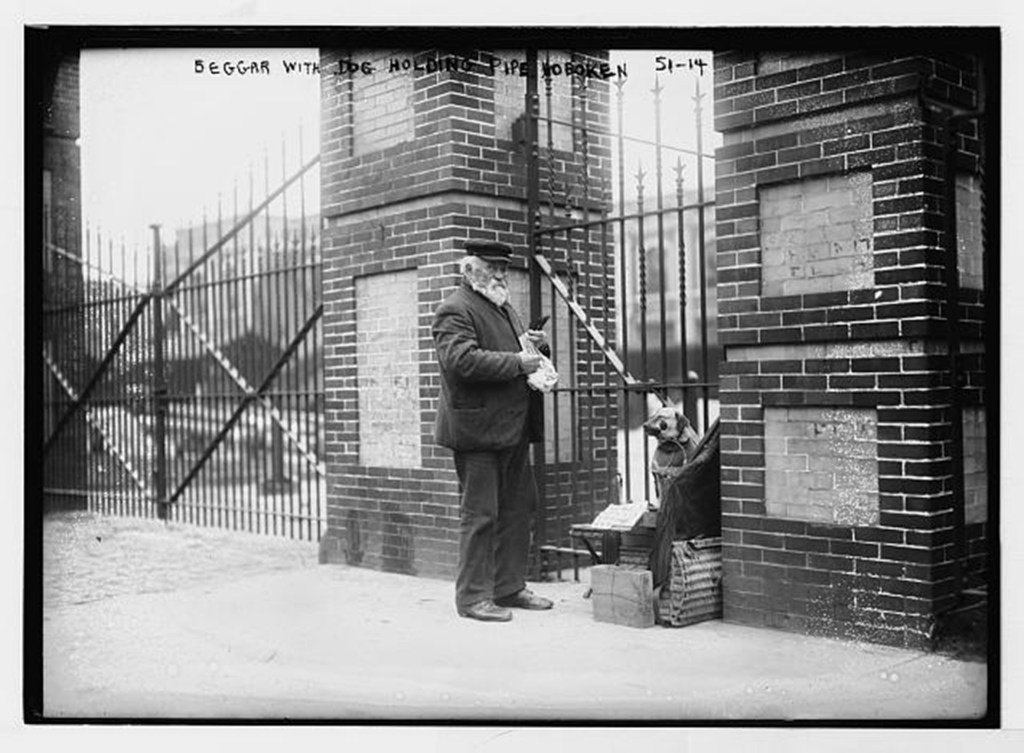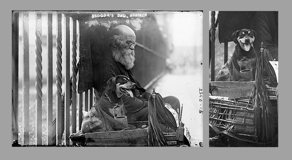 Doctor Ojiplático rescata la imagen de un mendigo con su perdiguero mestizo; una lata al cuello, una compañía y una protección. Las fotografías se realizaron en la localidad de Hoboken (New Jersey) hacia 1910. Algunos consideran que al perrillo le falta un ojo, pero es incierto; sí está delicadamente arropado con una redecilla. También observan que se acomoda sobre la parte superior de algo que perteneció a la casa Phenix (Co.), y que en realidad puede estar vinculado a cierto mecanismo para calzado; de ahí, esa cantidad de cordones que cuelgan y que acaso sean cintas de cuero; es posible que con ellos también realizara lazos, o lazadas o algo útil que ofrecer. Y ocurre lo mismo que en el filme Umberto D; no es el anciano el que mendiga, sino el perro… Pudo acomodarse junto a las verjas del por entonces Elysian Park. Recientemente esta fotografía fue añadida al grupo Best Photos of the World, y suele servir en la actualidad para ilustrar artículos de economía, déficit, carencias, pobreza, marginalidad….
