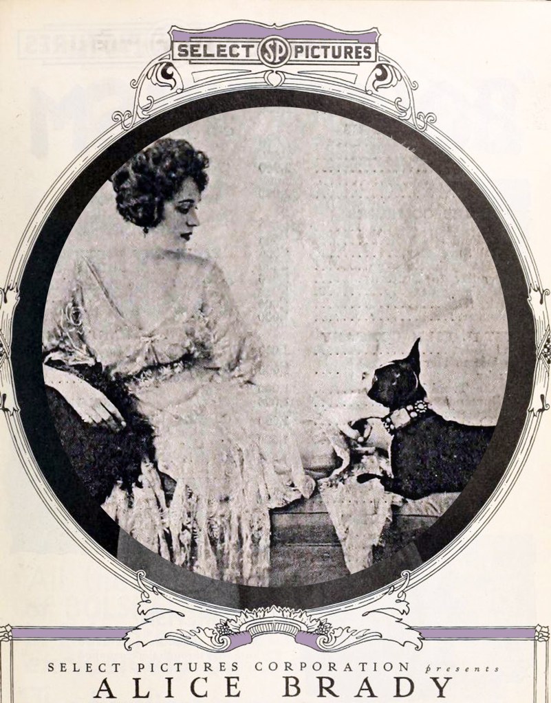 No es que le gustaran los perros, es que se consideraba militante defensora a tiempo completo, era la ‘devota’ número uno entre las actrices de su época, en la década de los años veinte (s.XX). Alice Brady nunca caminaba si podía evitarlo, nunca estaba de pie si podía sentarse y nunca afirmaba si podía mentir, solía decir en sus entrevistas. «…Ella convive en su casa con no menos de seis perros, nunca sale sin tres de ellos, alternando para ser perfectamente justa. No viajaba al extranjero, ni hacia giras, porque en los barcos, y en los camarotes, no permitían el acceso a sus perros, y los recintos perrunos no eran higiénicos. No tiene alfombras en su apartamento, y sus muebles eran elegidos a prueba de perros… Ofrecía ayuda constante a los actores amantes de los perros. Un amigo suyo, actor desafortunado que tenía un perro policía entrenado, fue llevado a los juzgados por impagos y bancarrota; el juez sentenció que el valioso animal se vendiera para liquidar las deudas. Alice contrató a un abogado, pagó la fianza y se hizo cargo de todos los gastos hasta que pudo obtener trabajo. Y no perdió a su pastor alemán. Ella mantiene una cuenta abierta en un banco de Hollywood para hacerse cargo del pago de los impuestos de licencia para los niños indigentes que no tienen como afrontarlo… Prácticamente, todas las estrellas con un perro se han unido a los Tailwaggers, un ambicioso club cuyo lema es «Lend a paw», desde donde se realizan campañas gratuitas de vacunación para contencion de la rabia, y también rondas y vigilancias para localizar a los envenenadores de treinta y siete perros de Hollywood, que hacen uso de carne molida envenenada que arrojan a los jardines privados…» (Entrevista para la publicación Silver Screen, 1937, dos años después de enterrar a su terrier Sammy en Los Angeles Pet Cemetery)