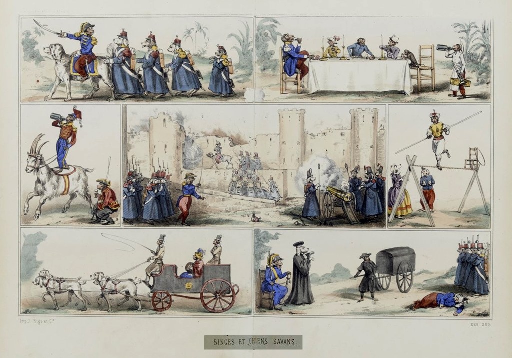 … Aquel teatro fue una corrala situada en Madrid, y allí se presentó en 1821 una compañía de perros sapientes, famosa por sus éxitos frente a las familias reales de toda Europa. La puesta en escena se dividía en varios actos y, según avisa la prensa de aquellos años, sucedía así: «…Malbruck hace rodar una carretilla, le sigue un abogado y un desertor arcabuceado… Un oficial atiende el perdón para el desertor, al que sigue un carro fúnebre. 2º Acto. Perros que caminan con dos pies, o dos manos. Un cachorro de tres meses es un volteador que gira sobre su cabeza… Luego representan el mundo al revés con cuatro perros. Madama Plateu mueve un torno de hilar, hace la reverencia al auditorio y se retira. Luego llega la peripecia de saltar a la cuerda, otros bailan una contradanza… En el acto 3º, Tobi, el perro inteligente, deletrea en cuatro idiomas diferentes, otro perro distingue todos los colores y otro más jugará al dominó correctamente y retará a cualquier persona ‘elegida’ entre el público.» Y el acto 4º finalizaba con el famoso perro encendido, que llegaba desde lejanas tierras, Rusia, y que ascendía en una especie de ‘algo’, rodeado de fuegos artificiales, y que luego descendía vertiginosamente, según se fueran apagando aquellos ‘fuegos’.