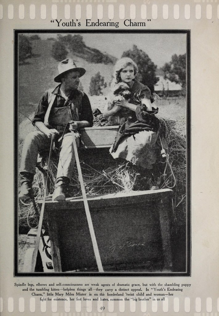 Mary Miles Minter será la niña huérfana junto a su perrillo Zippy, en Youth’s Endearing Charm (William C. Dowlan, 1916), una adaptación y guión de Maibelle Heikes Justice sin tópicos, melodramas o embelesamientos. La crítica decía, cuando se estrena en 1917, que había dos cachorros enérgicos y mimados en la cinematografía, y que ambos luchaban por ser la estrella indiscutible, Zippy Minter y Peter Fischer (de la actriz Margarita Fisher). Maitland Davis, crítico de Los Angeles Morning Tribune, le dedicó a Zippy un párrafo muy elogiador: «Es muy probable que este feliz canino nos haga olvidar a nuestro viejo amigo ‘Rags’, otra estrella popular para el público en general». Acaso se refería al también airedale terrier Rags I, por entonces vinculado a las producciones de William S. Hart, pues en aquella década más de tres pequeños canes, con el mismo nombre, se disputaban la pantalla y el cariño de los cinéfilos.