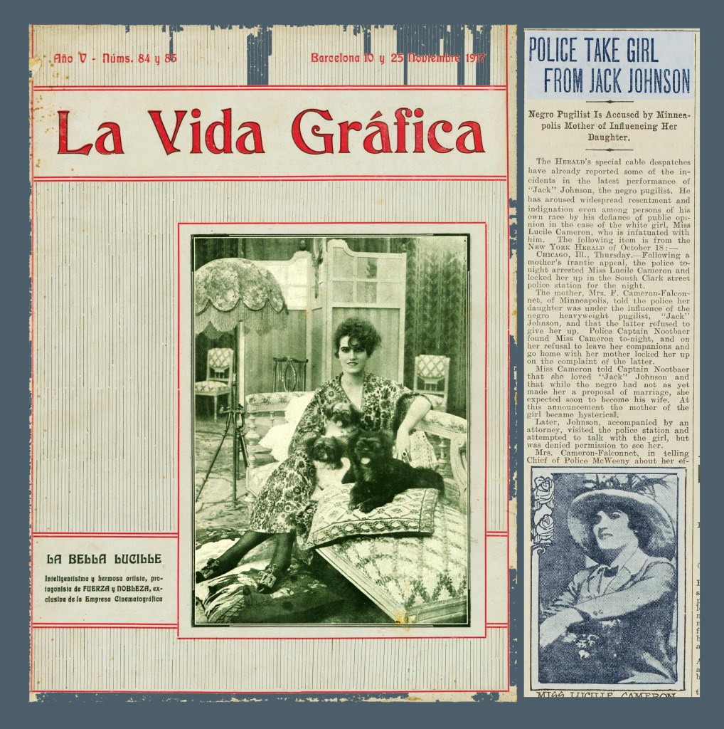Lo interesante de este comentario es que el pugilista Johnson, por entonces, enfrentaba la Ley Mann en los Estados Unidos, que penaba el matrimonio interracial. El ‘negro’ Jack Johnson se casaba con la ‘blanca’ Lucille (Cameron), y esto lo convertía en delincuente y a ella, casi en prostituta, al casarse en 1912. De la Bella Lucille, como pareja interracial que ayudó a cambiar ‘aquella’ historia, y actriz que ilustra la cubierta, sólo se sabe que era de origen francés, que fue recluida por orden de su madre, Cameron-Falconnet, en un reformatorio en Canadá por mantener relaciones con un negro, que él viajó para casarse con ella en Montreal, y que Lucille, la bella, además de adorar a sus tres pequineses, falleció en 1924 a los treinta y un años. Sylvester Stallone solicitó y logró del presidente Trump que se perdonase póstumamente a Johnson en 2018.
