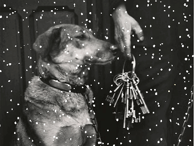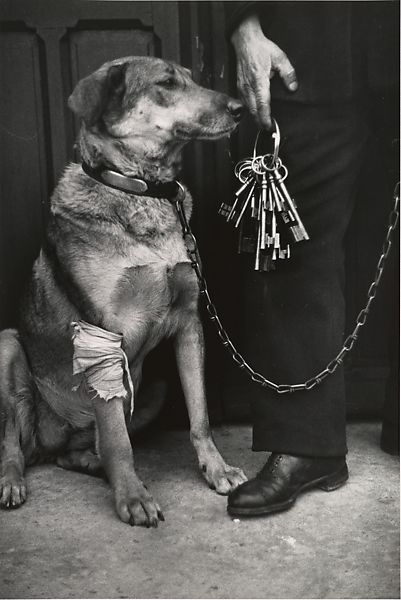 De quien escribía con la luz, queda esta fotografía, y muchos cientos más. Hacia 1940 retrata a este mastín, custodiando las llaves de Notre Dame en la mano de Caillon, el abad canónigo. Era un enorme falderillo de corazón atento al tintineo de llaves, más allá de las campanas, y más lejos de los siseos del bosque o de la nieve, y así sucesivamente; será una criatura atenta a las muchas apariencias de los sonidos, de la misma manera que la historia del perro está verdaderamente escrita en las armonías que solo él escucha. El autor de la fotografía, Kertész, narraba con la luz, y también con el afilado misterio de cada sombra, única.
