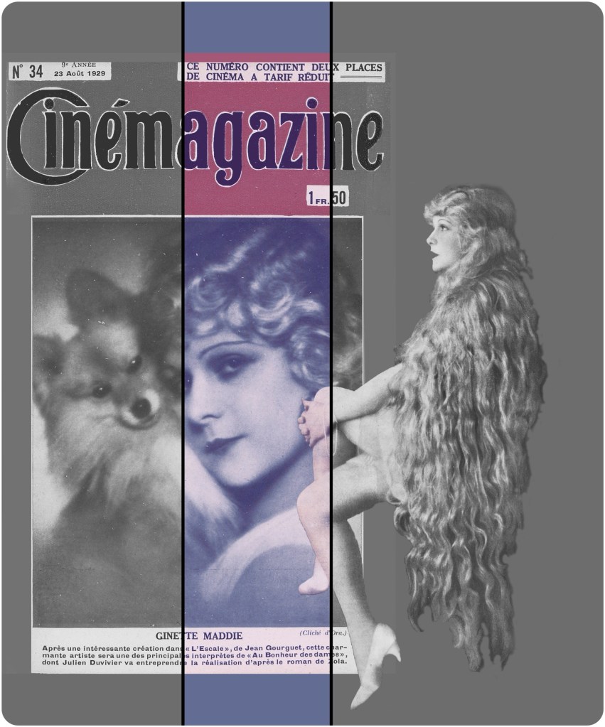 «Ginette Maddie tiene un gran amor, que no oculta. Se lo profesa a su hermoso perro San Bernardo, que la sigue a todas partes, como un falderillo y que siempre está dispuesto a defender a su ama de los entusiasmos violentos que despierta en sus admiradores. Este perro ha aparecido en varias películas con la artista y, a pesar de que siempre obtuvo éxitos muy merecidos, nunca se le ocurrió pedir a su señora y amiga un aumento de sala rio o de ración de comida.» (en La Unión ilustrada, 1923). En cierto sentido, los críticos de cine se referían a los perros en la pantalla, fueran grandes, medianos o diminutos, como seres a los que no se contemplaba con bastante respeto. Este San Bernardo al que se refiere el cronista era muy solicitado, nadie le molestaba, tenía su comida y su descanso, y muchas obligaciones promocionales, como cualquier otro actor. Era el perro personal de la actriz francesa Ginette Maddie (1898-1980), en este caso para el filme Le diamant noir (André Hugon, 1922). La actriz aparecerá en numerosas fotografías con su pomerano, y fue portada con falderillo en Cinemagazine, en 1929, ya entrando el cine sonoro con motivo de la promoción del filme Au Bohneur des Dames (Julien Duvivier), desde la novela homónima de Zola.