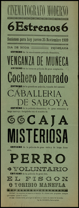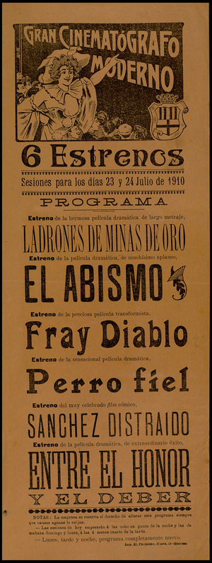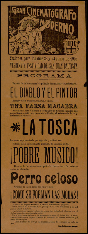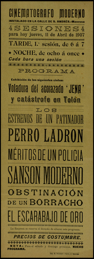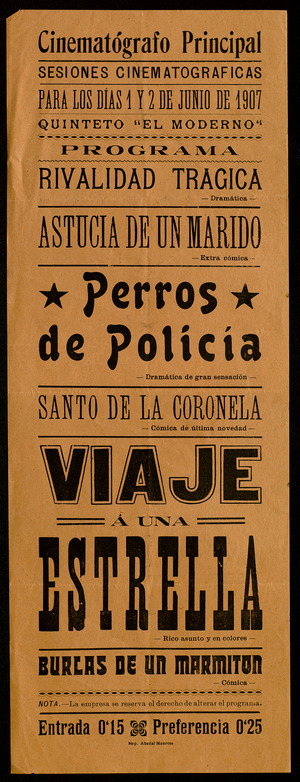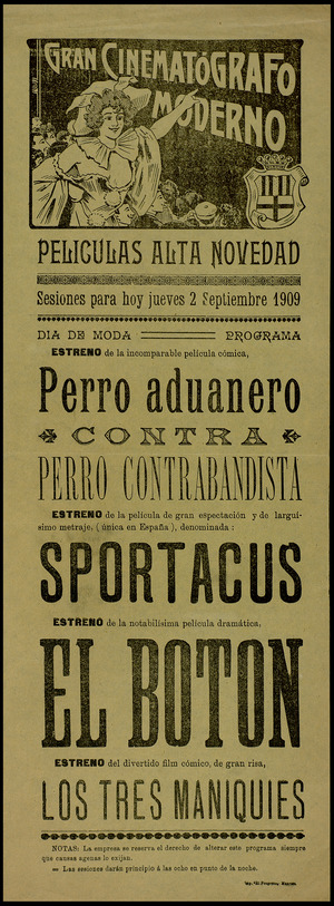 Perro celoso (sensacional película dramática de extenso metraje), Perro voluntario (de gran éxito y de larga duración), Perro fiel (sensacional película dramática), Perro aduanero contra perro contrabandista (incomparable película cómica), Perro ladrón, Perros de policía (cinta dramática de gran sensación)… Así era la programación de cine entre 1907 a 1910, anunciando los estrenos, lo que el público no debería perderse a las siete y media de la noche, y avisando que la empresa se reservaba el derecho de alterar el programa siempre que causas ajenas lo exigieran. El timbre daba su señal diez minutos antes de empezar la sesión (dos toques). Y según informaban, y dada la extensión de los metrajes, podían tener dos descansos durante la proyección. Extraño era que a principios del siglo XX faltara algún filme con perro en la programación.