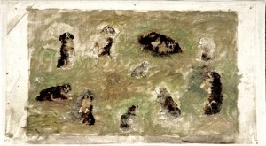 En este caso los perrillos están recreados por el pintor francés Armand Charnay, hacia 1890, y parece un boceto rápido y estudio de movimiento de varios falderillos (lulús) retozando en una de esas campiñas y jardines que el pintor idealizaba en sus lienzos.
