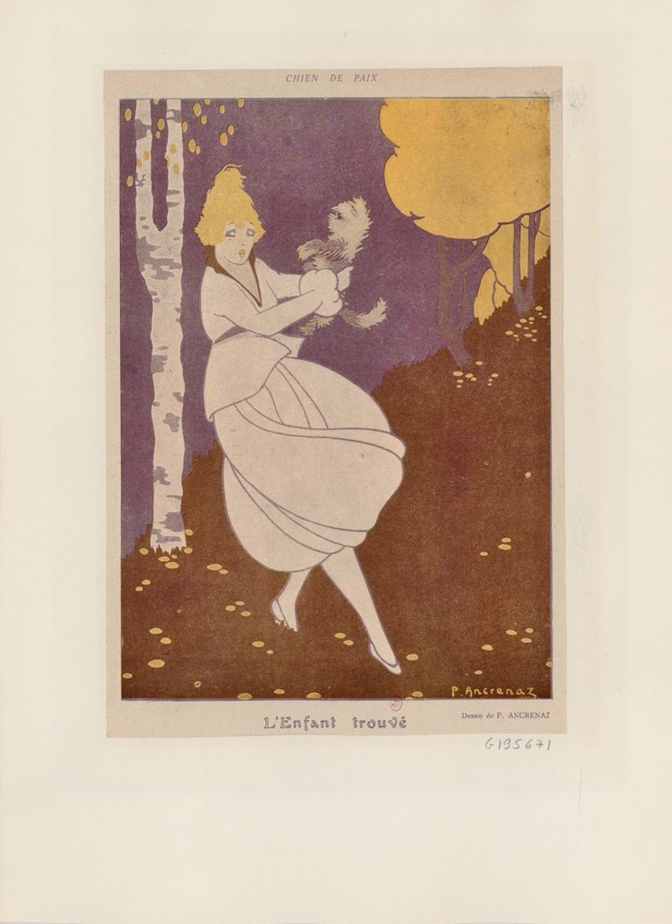 Trabajando el ilustrador francés Paul Ancrenaz (P. Ancrenaz) para revistas satíricas de la época, este «Chien de Paix» es posible que tenga un doble sentido, o varios y hasta pueden multiplicarse los razonamientos. El asombro de la dama puede indicar cualquier cosa, y más cuando fue dibujado en medio de una Gran Guerra para la revista Fantasio. Pero hay otra carambola implícita en este nombre, y es que esta firma trabajaba como fotógrafo para otras publicaciones, y en especial para la productora de cine Pathé Frères en los años 40 y 50 (s.XX). Podría tratarse de su hjo Pierre Ancrenaz, fotógrafo y cámara en varias filmaciones de los años 50, entre otras para el director Jacques Tati en las Vacaciones del señor Hulot. Lo dibujado es un falderillo, y Perro de la Paz, cuyo subtítulo «L’enfant trové» debe aportar algo más; o bien un suceso, un razonamiento, un aviso de nuevo… Acaso algún avezado lector pueda dar con la continuidad.