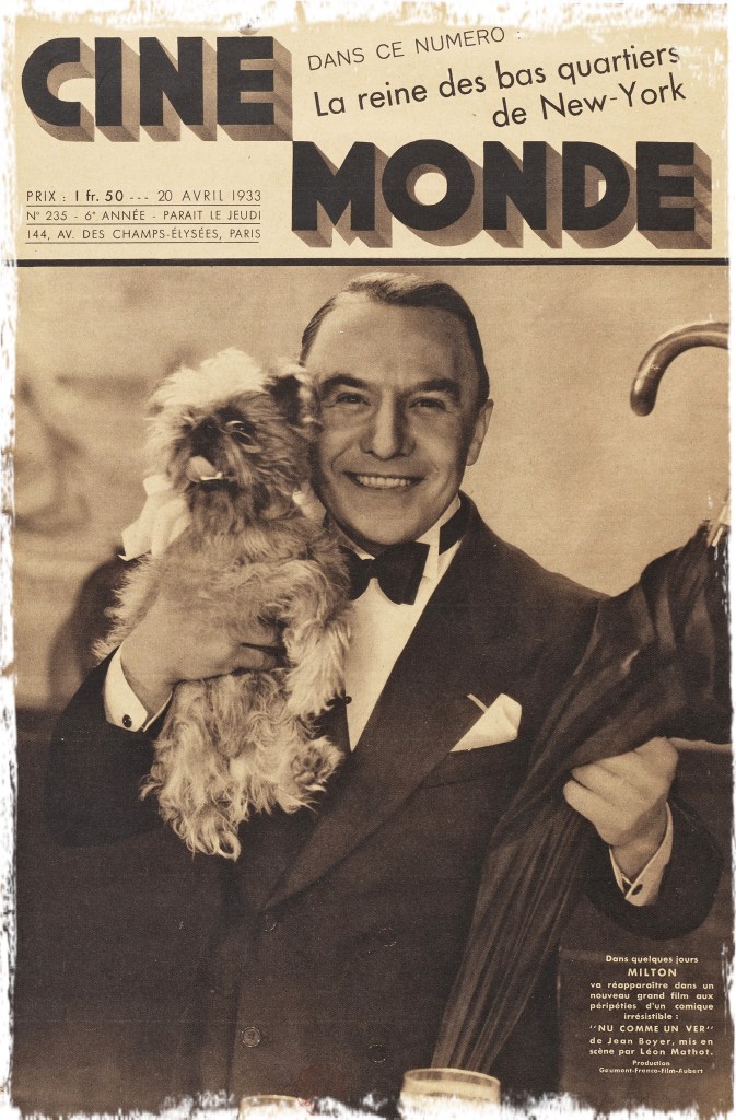 Con un cairn terrier y expresión de pequinés junto al actor Milton, y para la revista Ciné Monde (1933), se promociona el film Nu comme un ver (1933), a la vez que Jacques Deval, dramaturgo, director y actor, se expresa, explaya y hace el trabajo de un verdadero sabueso sobre todo aquello que sobrevuela la transición al sonoro, el arte en general, y los rastros en particular…: