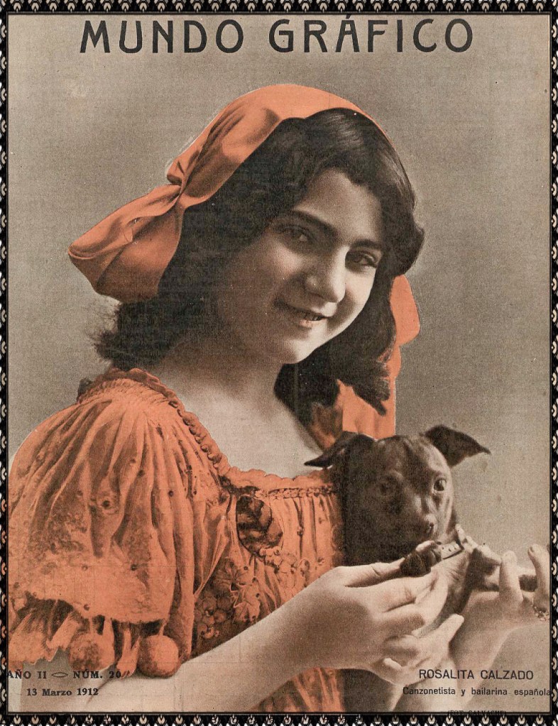 A París llegaba por primera vez (decían), en 1925, una compañía española para representar una fantasía lírica en 2 actos y 24 escenas, ambientada en 1800, con el título A la cigale. Las artistas tenían la intención de que el público apreciara el arte popular y querían mejorar el concepto sobre su país, además de limar asperezas napoleónicas…, acaso. Destacaron con Paisaje de Asturias, un pintoresco dúo campesino, y El encierro, dramatizado al estilo cinematográfico, «…mitad teatro, danza, canto y mímica», con el arte único y las mil seducciones de Rosalita Calzado (que comenzó su carrera junto a su hermana Paz Calzado). Parte de la compañía reunía a Montserrat Viladoms, Mercedes Soler, Sara López, Liana Orell, Luisa de Tormes, Flora de los Monteros, María Manzanares, María Wieden… Era 1925, y en París las denominaban las excelsas «Flores y mujeres de España». Pero en 1910 ya Rosalita era una artista consagrada en permanente “tournee’, y también había realizado un viaje alrededor del mundo que duró más de quince años, acompañada de su doguillo, aquí retratado a la manera francesa de los loulou o falderillos.