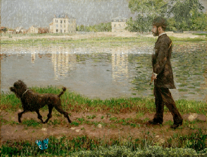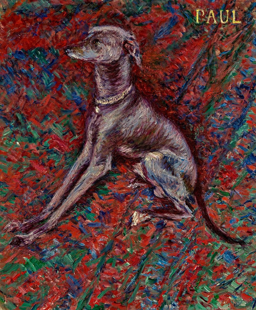 Paul es en realidad una especie de galguillo veneciano, lo dicen sus piernecillas delgadas y largas y ese cuerpo como en huida, además de por esa latente espera inquieta que tienen los perros pequeños. Era el ‘chien’ del fotógrafo Martial Caillebotte, (hermano del pintor Gustave Caillebotte). Ambos hermanos recibieron una considerable herencia, siendo el padre un muy reconocido contratista de camas para el ejército, se dedicaron ambos al arte y fueron mecenas durante décadas. El amable Gustave pintó a Paul sobre un elegante tapiz. Aseguran los entendidos en época impresionista, que el patrón floreado se asemeja a la alfombra que se puede ver en Déjeuner (Berhaut, núm. 37; colección privada), y que el pintor destacó el nombre en letras doradas similares a las que podríamos encontrar en los iconos bizantinos o en los escudos medievales.