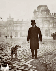 Gustave Caillebotte y su perro Bergère en la Place du Carrousel, París 1892. Fotografía.