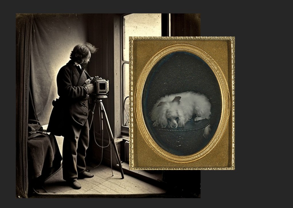Realizada con cámara, este daguerrotipo se tomó en 1826, y se tituló «Caniche con lazo en la mesa», siendo el fotógrafo un misterio. En cierto sentido, es una proeza, pues ese sistema necesitaba una exposición muy prolongada para que el positivo directo quedara sobre la placa de nitrato. Es decir, la caniche debía de estar inmóvil por completo, aunque lo que sí parece advertirse, en su quietud, es que es muy mayor y acaso esté enferma, de ahí su laxitud. Pudo verse este considerado «primer retrato de un perro» en el año 2012, en la galería de arte Kennel Club en Mayfair (Londres), cuando se celebró una exposición de fotografías antiguas de perros, y fue adquirida, en el año 2009, a través de la casa Sotheby’s, por 8.125 dólares.