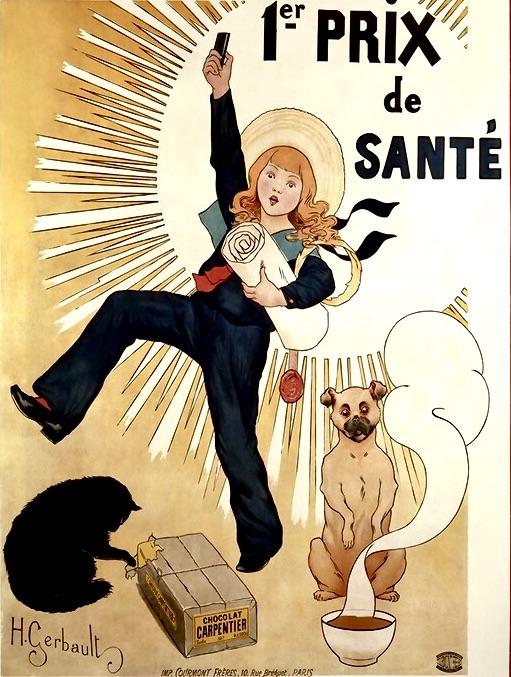 Se vende hoy como afiche decorativo, o sirve para material ‘vintage’ en postales, rompecabezas y otros ‘ornamentos’ de este maestro del cartelismo, Henri Gerbault. Tomaban chocolate la bellas mujeres de Alfons Mucha (Art Deco), y lo mismo hacía la marca Klaus. El chocolate, «la medicina», fue el negocio de la Casa Carpentier, inmersa en una serie de reyertas empresariales y litigios, desde 1907, contra Leprou y Bourdreau en París, cuando se disputaban el mercado Chocolat Besnier, Chocolat de la Cie agricole, Chocolat G. Gibert, Chocolat L. Seine, Chocolat Dewinck, o Lorrain… El reclamo publicitario es exacto al actual, uso de niños y niñas junto a perros o gatos que se disputan un dulce o una golosina. Hoy en día, la casa Carpentier es más conocida o recordada por este cartel publicitario de Gerbault que por su cacao.