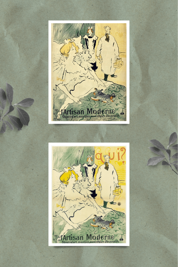 Ya lo avanzó Toulouse-Lautrec en esta litografía ‘crítica’ publicitaria de 1894: Objetos de arte, muebles decorativos y un operario con su caja de herramientas y martillo para colocar y exponer…, por encargo de la Galería Vivienne de París. Ahí está retratado el mundo de los galeristas que él conoció hasta la repugnancia; lo que hacen, lo que ni saben porqué cuelgan y exponen, o exponen y regresan, o venden y ocultan, o malvenden y reinterpretan… En realidad, el pintor está mostrando ese «¿…Qué hacemos con esto?», junto a la eterna dama (la modelo Marie, o Lily o Suzanne) con su falderillo dispuesto a defender la colcha, el almohadón y lo que se ponga por delante. Por alguna incomprensible razón, en algunos carteles y su reproducción actual han desaparecido el «qui?» original, y así lo han descontextualizado –y vaciado de sentido–, y lo han usado para estudios de arte erótico. Un grandísimo y grave error actual, frente a la aplastante crítica de Toulouse.
