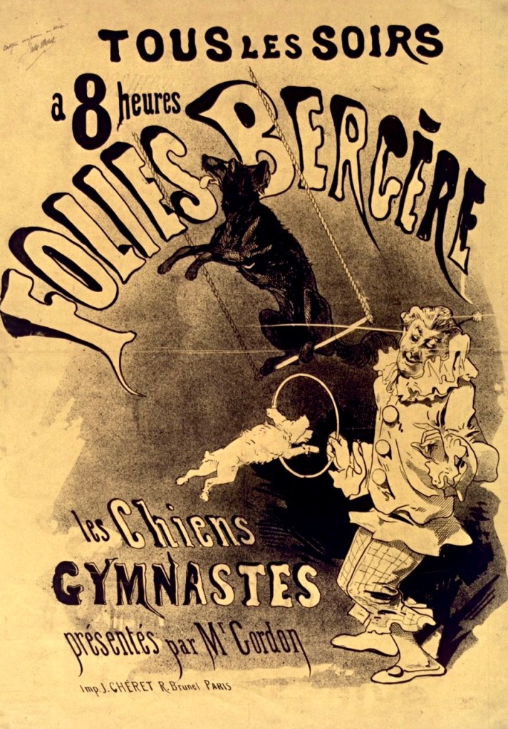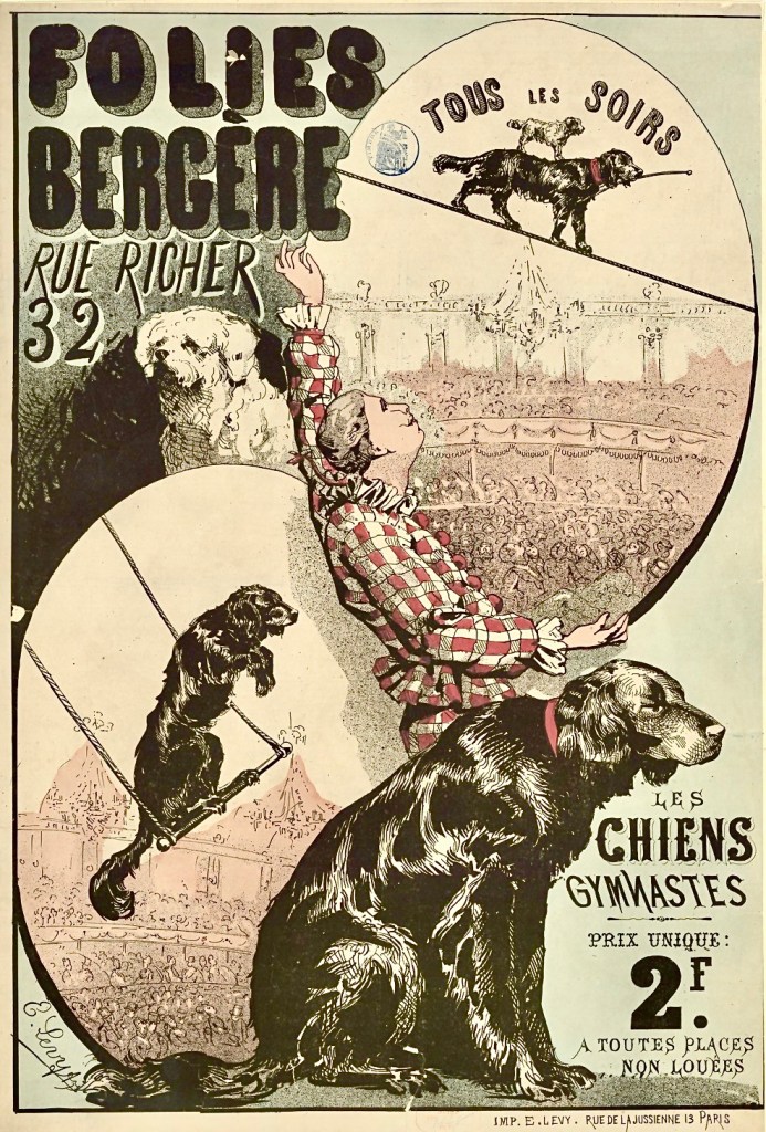 Los perros gimnastas eran dos, un hábil setter negro y una bichon maltés, o un caniche miniatura (según), que contrastaban en los saltos y equilibrios (el fuerte que sostiene y el liviano que actúa ser la habilidad y agilidad reunidas). Trabajaban todas las noches para el teatro de variedades Folies Bergier, en la calle Roche de París. Iban acompañados del dueño de su existencia, una especie de juglar animoso y escéptico, que funcionaba como ‘meter du escene’, conocido como Mr. Gordon. Triunfaron y asombraron al público entre 1874 a 1876, y luego se disolvieron, acaso para cambiar de actuación , o de aspecto, o de lugar.