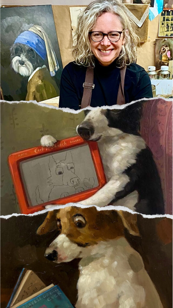 Al respecto de la pintora britànica Alison Friend (1973), su biografía dice que fue la primera mujer albañil de la ciudad de Nottingham… Hay pinceladas delicadas de ensueño que abundan en cada lienzo donde captura la vida secretas de los animales. Cada personaje cobra vida, ya sea tomando un caramelo o una ginebra. Quiere que el espectador participe en el proceso creativo, tal y como lo explica: «…Empiezo con una idea para un personaje. Tengo muchas en mi cabeza. ¡Es como una sala de espera hasta que llega su momento! Por muy fuerte que sea una idea para un personaje, adquieren vida propia. Eso es lo que me encanta. Los voy conociendo a medida que avanza la pintura. Mantengo los comienzos de una pintura muy sueltos y unas cuantas pinceladas pueden crear una expresión particularmente divertida y, de repente, ¡ahí están! Realmente me concentro en esas miradas que nos dan nuestras mascotas. Pensamos que tienen emociones humanas y trato de capturar eso. Es cómo nos conectamos con los animales en nuestras vidas. Espero aportar lo suficiente a la obra para que el espectador cree su propia historia para el tema. Quiero que el espectador sea parte del proceso creativo».