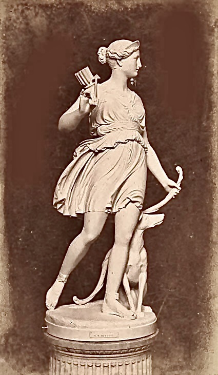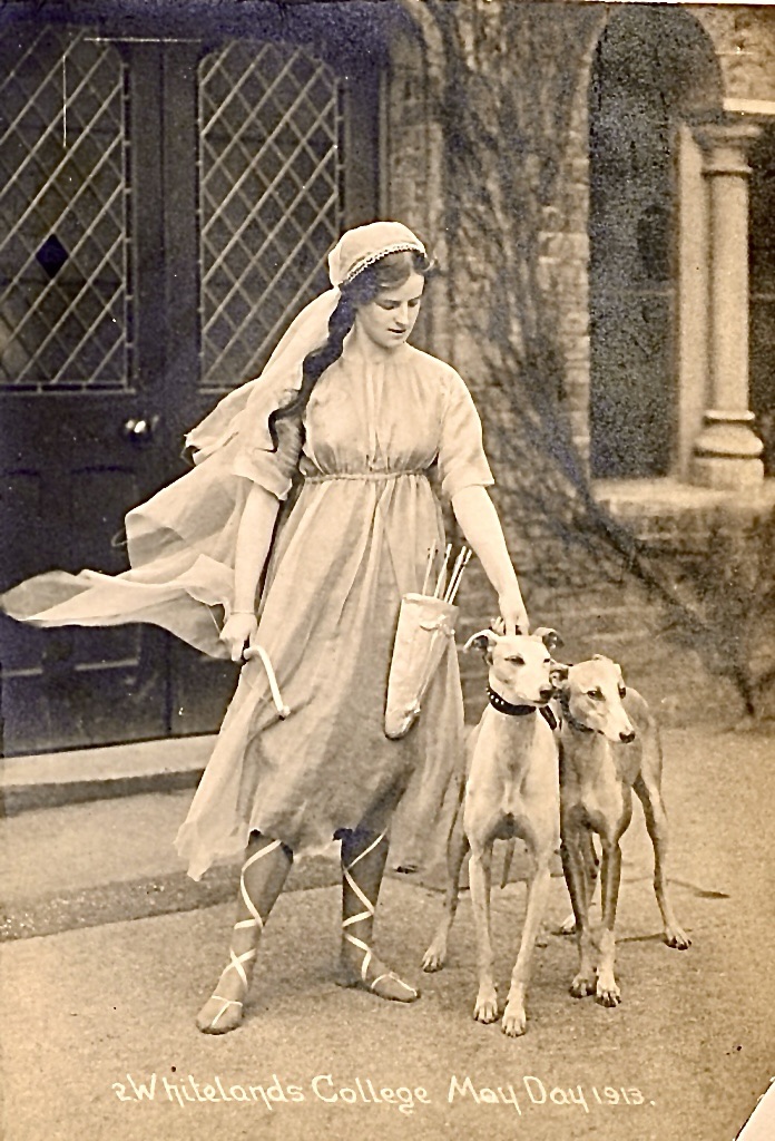 En 1881, desaprobando la idea de una entrega formal de premios, Ruskin sugirió una ceremonia anual para elegir a la reina de May-Day. La fotografía, de 1913, nos regala la recreación de Diana Cazadora (la Artemisa griega) con dos galgos, ideada por una alumna en los jardines de Whitelands, una escuela de formación para futuras maestras.