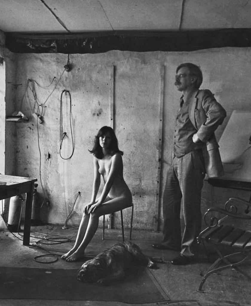 8. Un homenaje a Manet (Olympia –after Manet–, 1977), con el atento perro blanco (en sustitución del gato negro de Manet) que observa la mano azul que rechaza cualquier acercamiento, ofrenda o regalo. El pintor que la retrata, y la oculta con pintura, queda disuelto en la oscuridad.