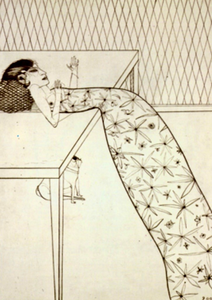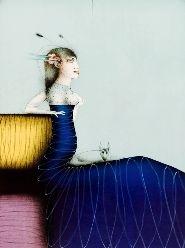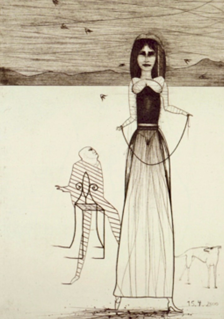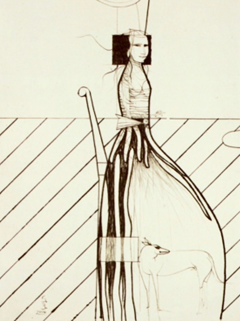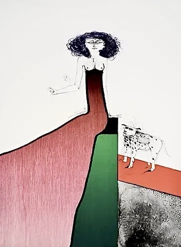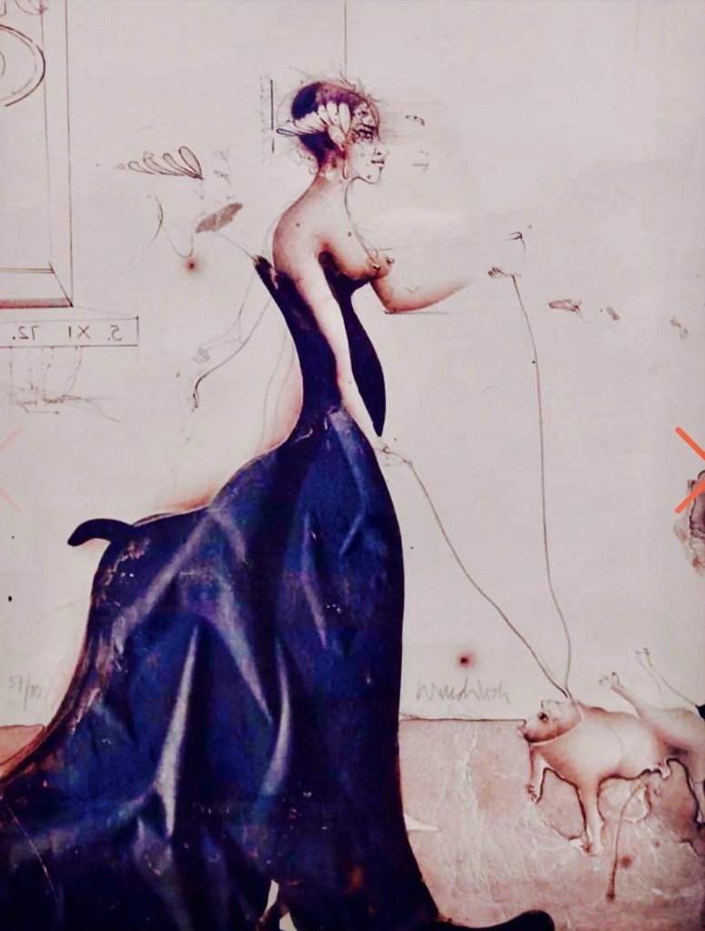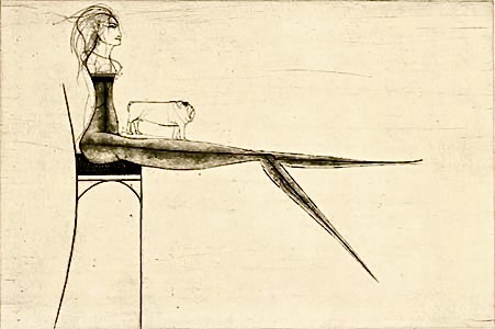 El falderillo carlino Antón en el halda de la estilizada Daniela, aguafuerte de Paul Wunderlic, 1969-70