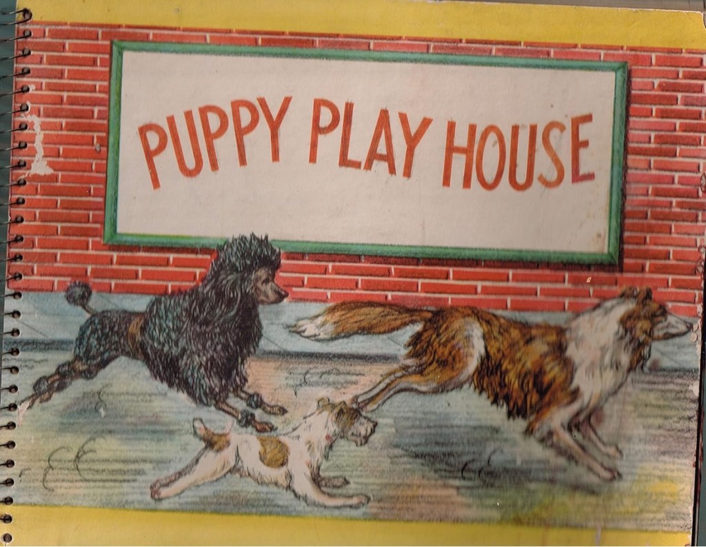 Anon., Puppy Play House (Polygraphic Company of America, Inc., 1951). Spiral-bound (with metal spiral) pictorial board cover, colour illustrations, heavy board cut-outs of six different dog breeds, one a Poodle. Story of Mr. Traynor who owns a pet shop where he sells all kinds of dogs. One warm day he left the door open and all the dogs raced out and chased after the fire truck. The second part of the story includes the door to the firehouse where all the dogs are caught (and can be stored) which opens to allow the reader to remove the dog cut-outs. The story continues with Mr. Traynor who is so happy that you’ve caught all the dogs that he wants you to return to the pet shop with him and put each dog back in its own bed. The remaining pages devote a page each to each dog breed with a bed (pocket) in which the reader is able to slide in each dog cut-out.