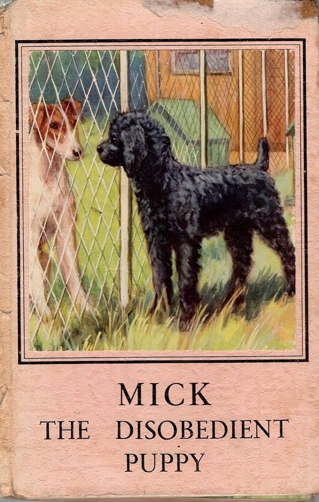 Barr, Noel, illustrated by P.B. Hickling, Mick the Disobedient Puppy (Loughborough: Willis & Hepworth, Ltd., undated–ca ’50’s-’60’s). Ladybird book, 50 pp. A boy, Peter, turns eight, receives a black Standard Poodle puppy for his birthday. The puppy, Mick, gets into the usual puppy mischief; owners send him back from whence he came for obedience training; he stays a week and runs home, sneaks into the house and saves it from a fire. After that, he is the most obedient puppy.