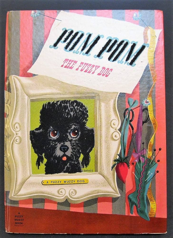 Cunningham, Virginia, illus. by Catherine Barnes, Pom Pom the Fuzzy Dog, a Fuzzy Wuzzy Book (Whitman, 1947). Pom Pom is a French Poodle who lives with Mamzelle Mimi at her Hat Shop, and he is very offended with a little black kitten arrives.