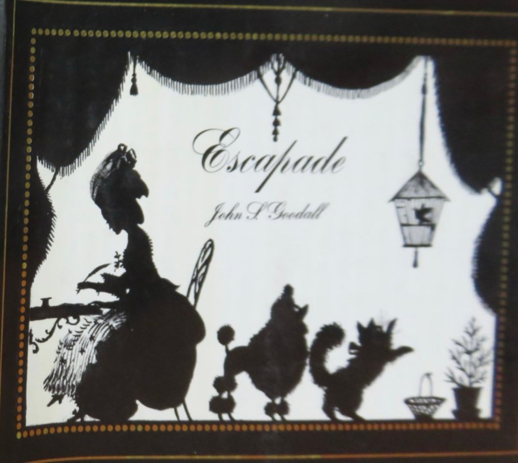 Goodall, John S., Escapade (London: Macmillan, 1980). The story of a lost canary, featuring a fluffy cat and a Poodle, all told in silhouette with use of half and whole pages to enable changes to be made to the illustrations.