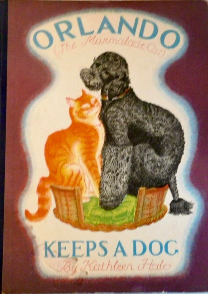 Hale, Kathleen. Orlando the Marmalade Cat Keeps a Dog, revised edition (London: Frederick Warne & Co., 1990). First published by Country Life Ltd., 1949. Orlando, a beautiful marmalade cat with eyes like «twin green gooseberries» and his wife Grace decide it would be good for their kittens to be allowed to keep a pet. They place an advertisement in the newspaper –«Pet wanted for three kittens». A frightening array of animals apply for the post, but in the end they have to adopt Bill the Poodle, simply because he refuses to go away. Bill moves in (bringing his own pet, a cat called Flute), and life is never quite the same again. Kathleen Hale based almost all her characters on real animals and the well-meaning but boisterous Bill was a Poodle who was part of her household in the 1940’s, along with the real-life Orlando, the marmalade cat.