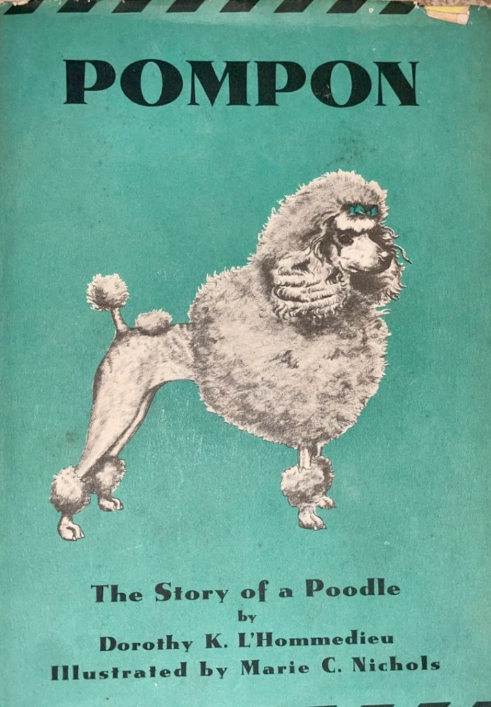 Hommedieu, Dorothy K. L’, Pompon–the Story of a Poodle (NY: Ariel/Farrar, Straus & Young, 1955); 55 pp., illustrations by Marie C. Nichols. Pompon was a Miniature Poodle who lived in a big city apartment. But–he had never been allowed to roam. So–when he and his mistress went to visit friends in the country, he anticipated high adventure, and–he found a master who appreciated him for himself, not just because of his beauty. Chapter book for children; Poodle story with glimpses of Cocker Spaniel, Basset, and Westie.