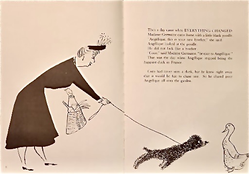 Janice, Angelique, illustrated by Roger Duvoisin (NY: Whittlesey House, 1960), 32 pp. Angelique, a duck, lived happily in a beautiful garden in Paris. Black Poodle Coco arrived; Angelique ran away; she met a big cat and a brave little sparrow; learned that running away is not a solution: one must defend one’s home.