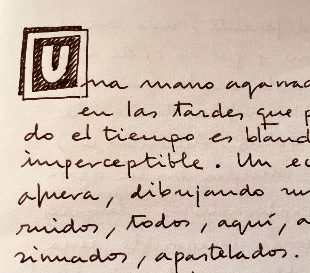 «Una mano agarrada al lápiz en las tardes, para cuando el tiempo es blando y apenas imperceptible. Un eco, allá afuera, dibujando sus rayas de ruidos, todos, aquí, apenas insinuados, apastelados.